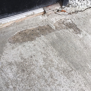 From bad to worse: Above a cementious overlay zoomed in. Moisture and mold creep underneath the overlay and de-laminate it from the concrete slab.
